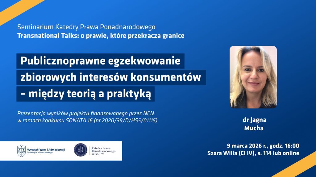 Serdecznie zapraszamy do udziału w kolejnym seminarium z cyklu „Transnational Talks: O prawie, które przekracza granice”. Odbędzie się ono w dniu 9 marca 2026 roku o godz. 16.00 w sali 114 Collegium Iuridicum IV (Szara Willa, ul. Wybrzeże Kościuszkowskie 47)